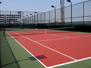 這是一種現(xiàn)場澆鋪用刮板制作在瀝青混凝土上或鋼盤混凝土結(jié)構(gòu)地面上的新型材,其工藝主要分為找平結(jié)合層、加強(qiáng)層、耐磨層等多層做法,還有含膠粒的多層做法這種面層材料及工藝的優(yōu)點是平整度高、表面硬度高、耐磨、抗曬、色澤鮮艷、使用壽命長便于管理和維修。這種面層材質(zhì)穩(wěn)定的網(wǎng)球場近年來已開始在世界各地普遍采用,管它球速稍快,較之其它類型球場,球的彈跳平衡,球員場上跑動舒服,是一種既可供娛樂打球也可用做正規(guī)比賽的高檔次網(wǎng)球場地